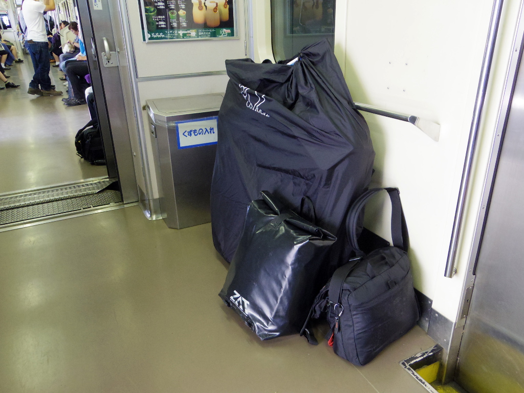 これが今回の荷物一式。輪行バッグに自転車。ショルダーバッグには着替えや仕事関係のもの。そして防水リュックにキャンプ道具一式を詰め込みました。