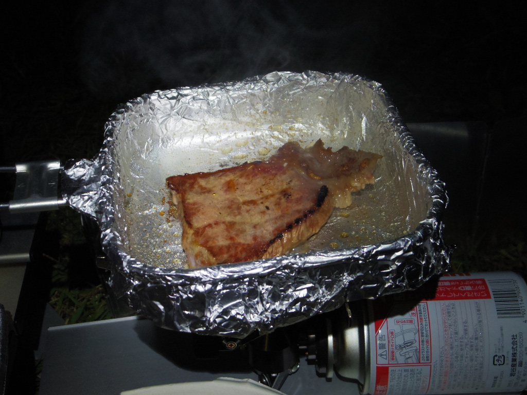 山クッカー角型3に付属の角型フライパンで焼きます。今回は利用後の手入れの省力化のため、クッキング用ホイルを被せて使いました。