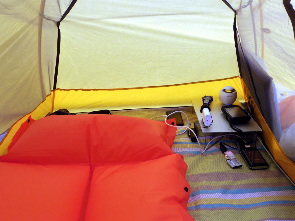 食事が終わり、寝る前には、熊が来ないように食材を片付け、テント内では明日の活動に備えて各種電子機器を充電しておきます。