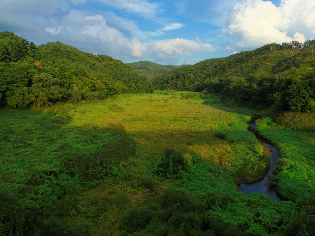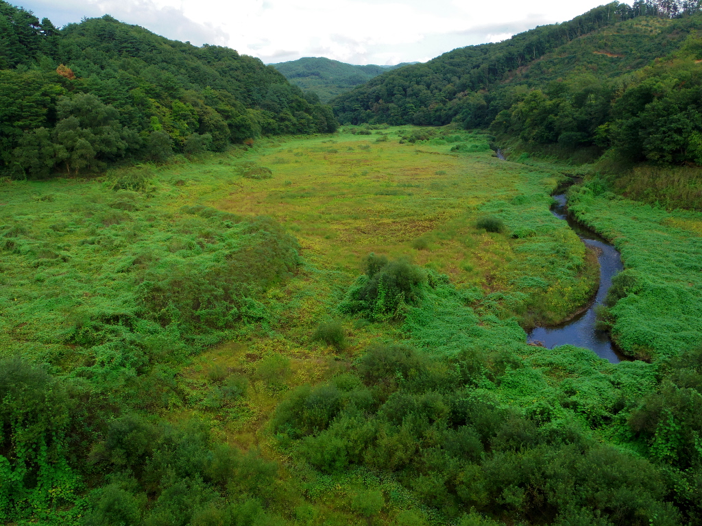 翌日は鉄道を使わず、走って盛岡へ戻ることにしました。その途中、南部片富士湖の上を通る陸橋からの風景が殊の外きれいだったので止まって写真を撮りました。