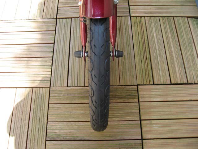 このタイヤのトレッドパターンの場合、直進状態でタイヤが地面と垂直になっている状態では、ほとんどスリックタイヤのような特性になります。したがって、直進状態で路面コンディションが良い場合、非常に滑らかな走行感覚です。路面が荒れていても、サイドウォールが柔らかい(薄い)ため、ほどよくショックを吸収します。