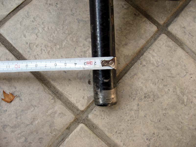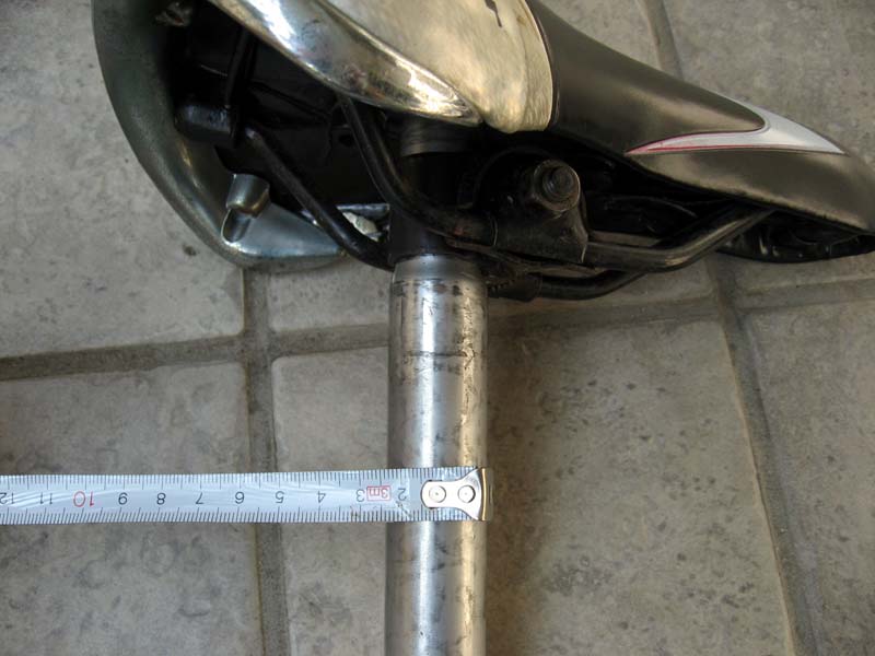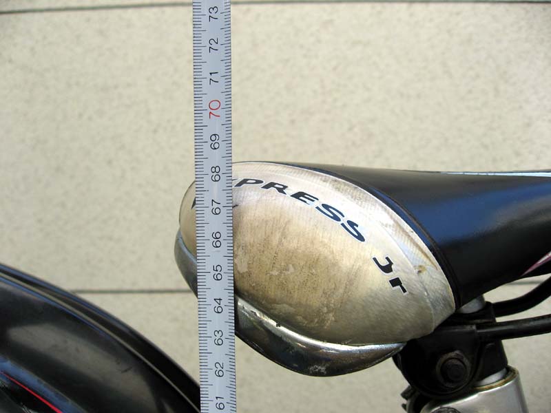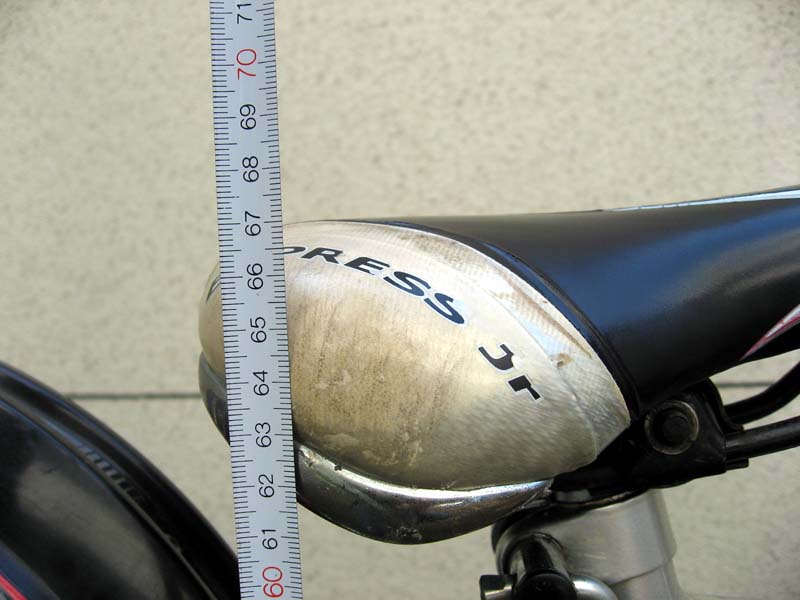 次に、26インチの自転車のサドル高を測ります。このタイプのジュニアサイクルは、大人用の通常の自転車と比べてサドルの高さを相当低くできるように設計されています。シートポストを限界まで下げてみます。