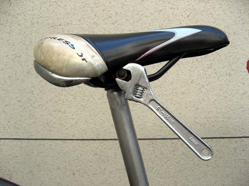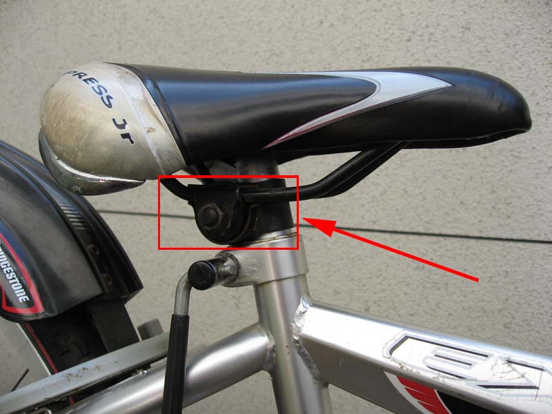 実際に子供をまたがらせてみると、両足のつま先が何とか着く位。このままだと安全に乗れそうもありません。そこで、このようなあと数cmでもサドル高を下げたいときに利用されている裏技、「やぐら返し」を行ってみました。「やぐら返し」とは、サドルをシートポストに取り付けている「やぐら」を反対に装着してサドルをギリギリまで低く装着する方法です。
