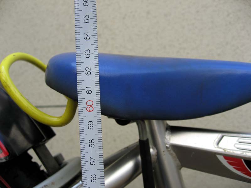 サドル高を測ってみます。「63cm!」対策を講じる前に比べ、5.3cm もさらにサドルを低くすることができました!