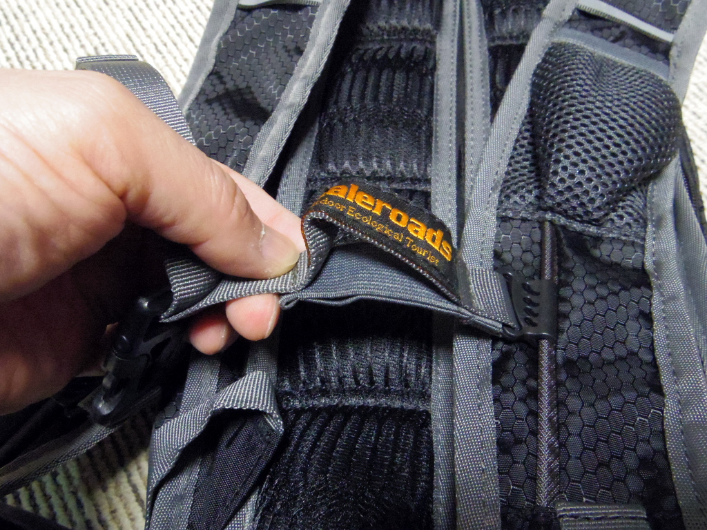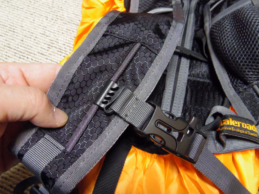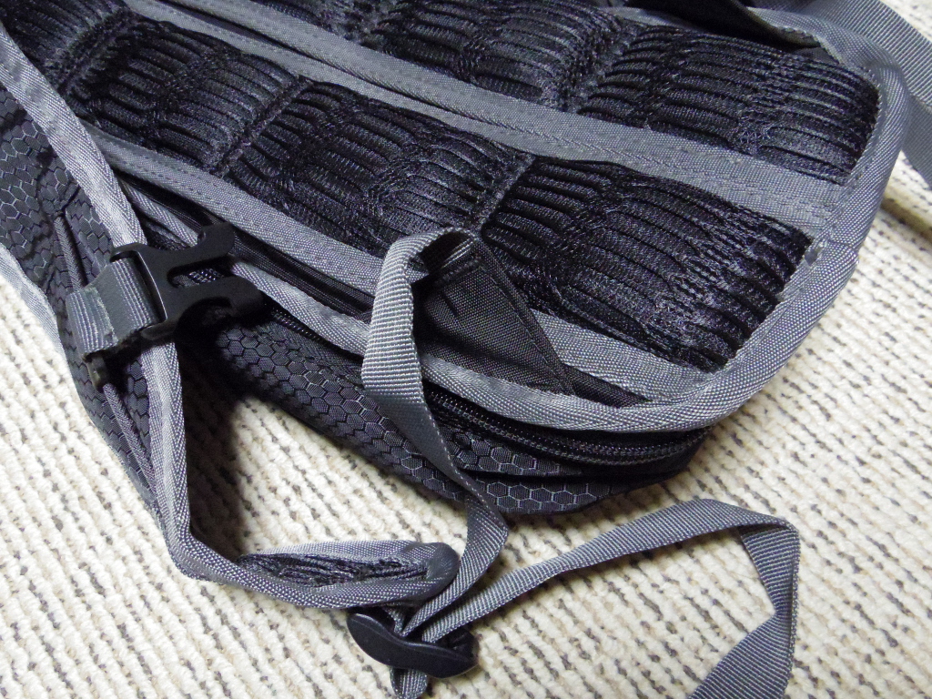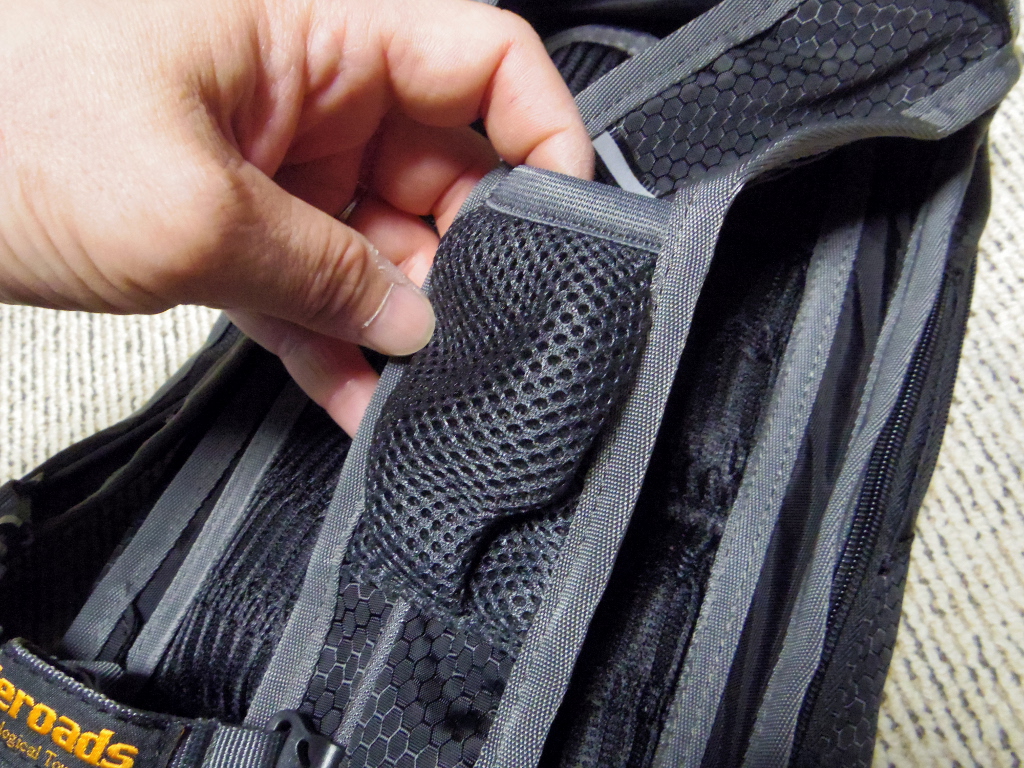 背当ての部分は通気性確保の対策としてメッシュ状の立体パッドがしつらえてありました。バッグが背中全体を覆うように貼り付くこと防止するように考慮されています。