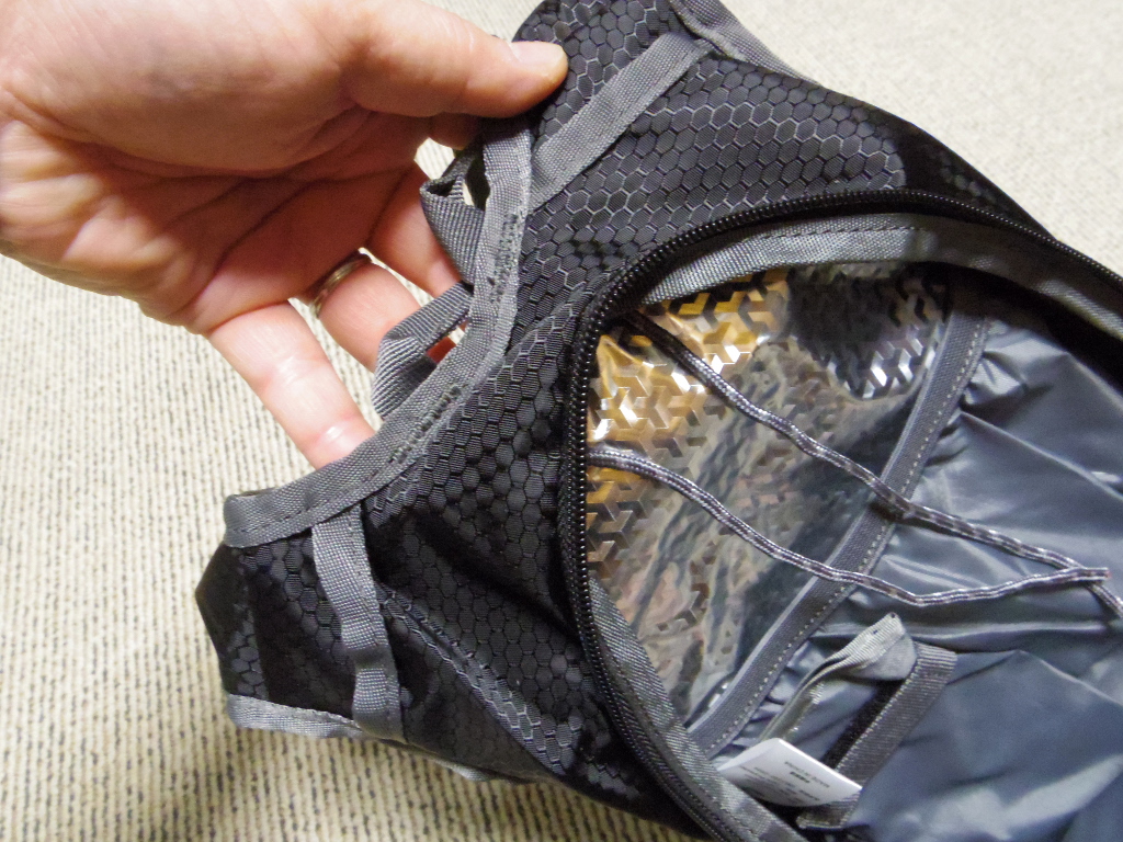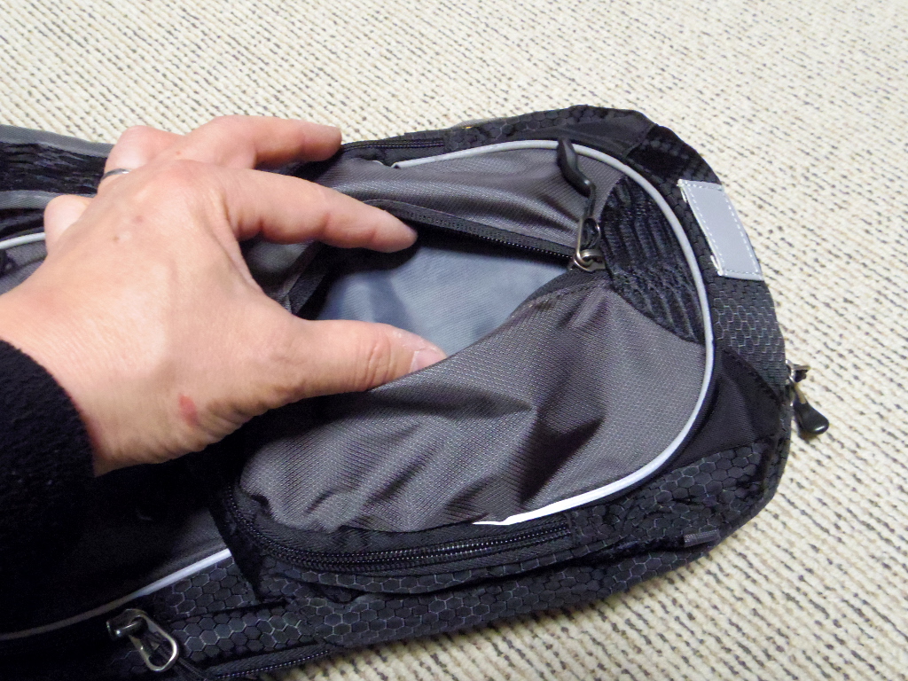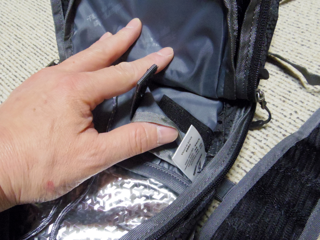 まずは、メインコンパートメントを開けます。背中側にはウォーター・ハイドレーションパック収納用のポケットがあります。体からの熱を遮断する効果がある銀色の素材が配されています。ハイドレーションパックを使わない場合は、タオルやタブレットなどを収納可能ですね。