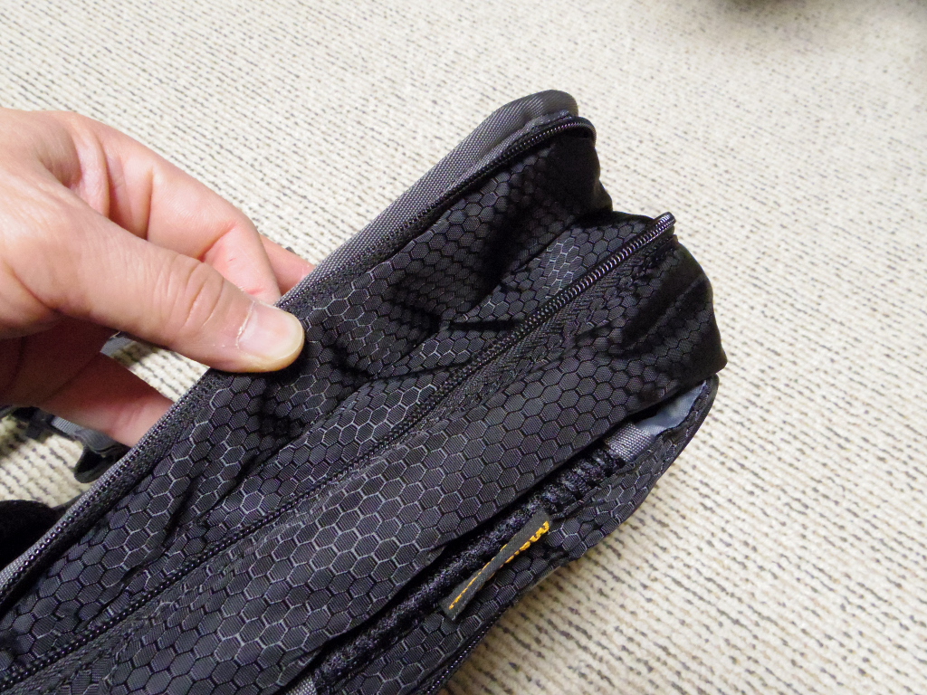 最後に前面ポケット。こちらには薄手のものを収納することができます。構造上、この部分の方が収納物が脱落しにくそうなので、財布やスマフォはここに入れるのが良いのではないでしょうか。