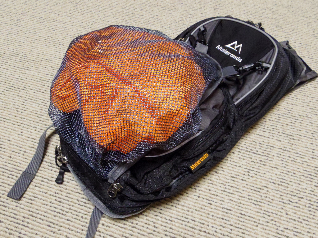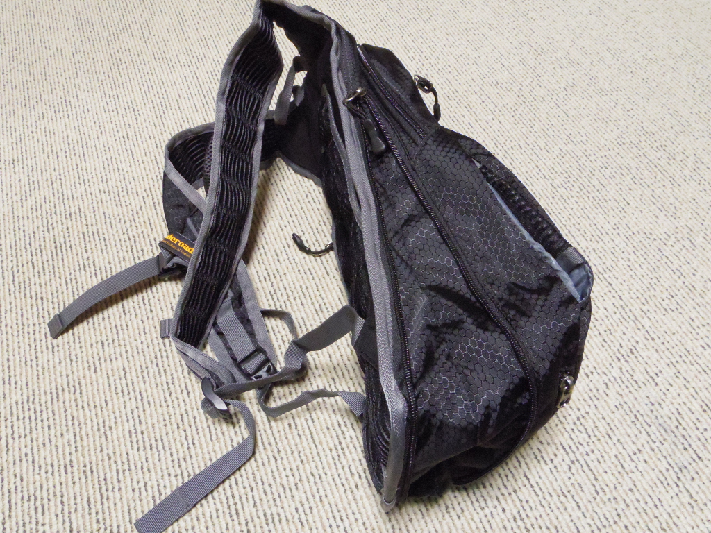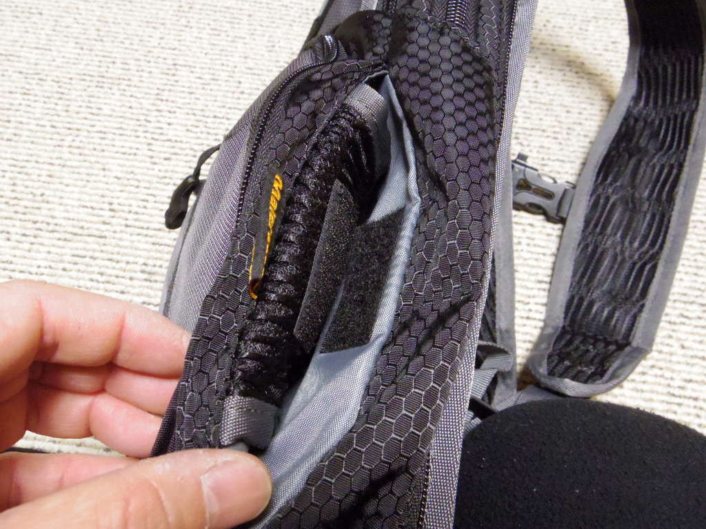 左側のショルダーストラップにはこのようにメッシュポケットが付いています。このポケットは小さめなので、スマフォは入りません。ここに入れるべきものとしては軽くて小さいもの。小型補給食、畳んだコンビニ袋、ハンドタオル、ポケットティッシュ、ウエットティッシュなどでしょうか。