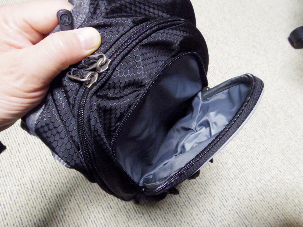 続いてはサードコンパートメント。ここにはメッシュポケットやベルクロ止め小型ポケット。キーホルダーなどがあります。小物を入れておくのに便利です。ファスナーを全開にすると、これだけ蓋が開いてしまいますので、ここに大事なものを入れる場合は、背負う前にファスナーが閉じているか確実に確認することが必要だと思います。