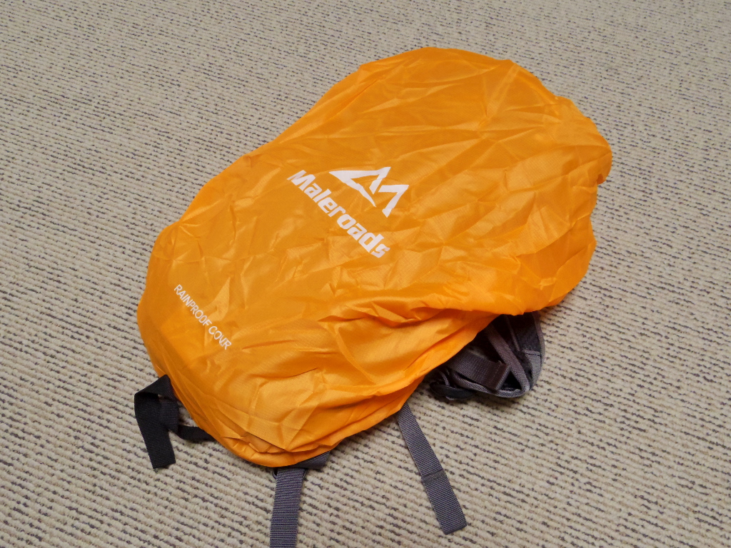 バック最下部にはファスナーがあって、それを開けるとレインカバーが収納されています。レインカバーは鮮やかなオレンジ色です。