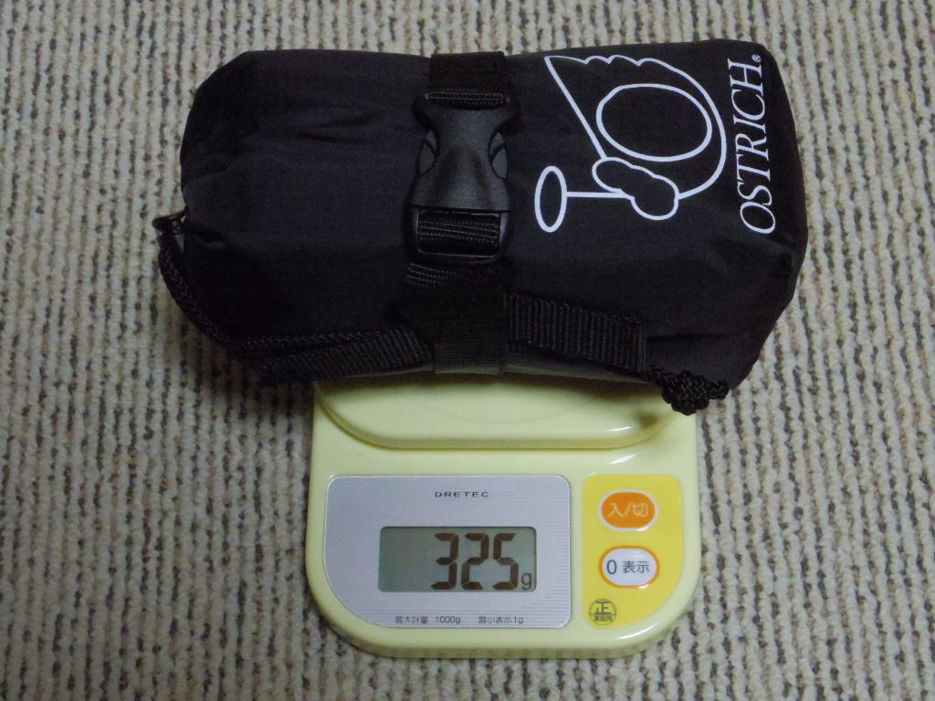 お決まりの計量です。まず、輪行袋(L-100)は、肩掛けストラップ、結束用ストラップ、収納袋込みで、325g。