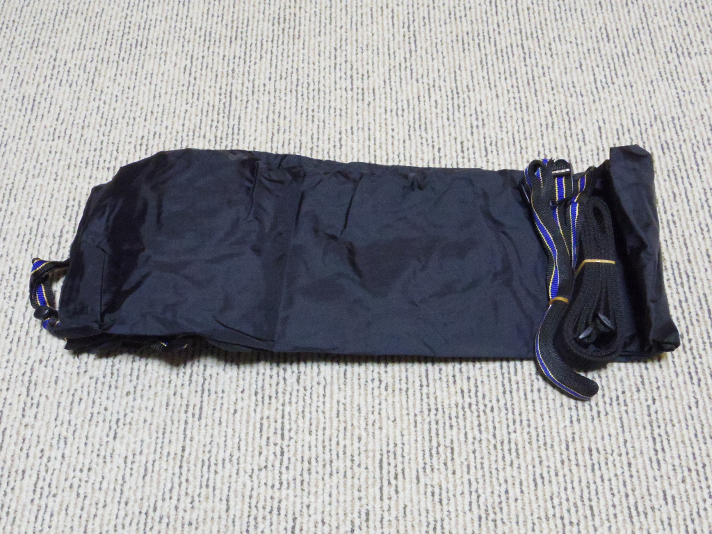 輪行袋本体を開けてみると、袋と肩掛けストラップ、ホイール固定用バンドが3本入っていました。