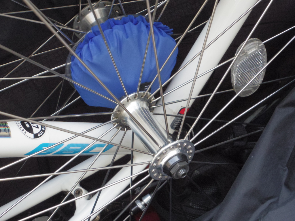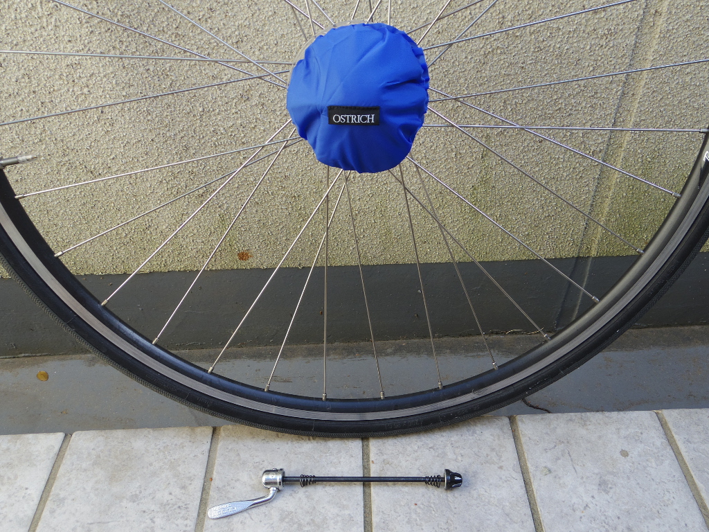 ちなみに、前輪のクイックリリースシャフトは外さなくても収納ができますが、担いだ時に体に当たるので、私は外して、輪行袋の収納袋に入れています。袋にはストッパー付きのひもが付いていますので、口を絞って閉じておくことができます。サイクルコンピューターなど、小物を外した場合もこの袋に入れておけばよいですね。