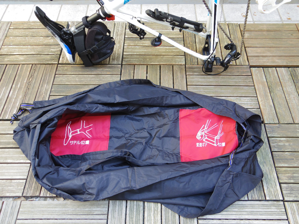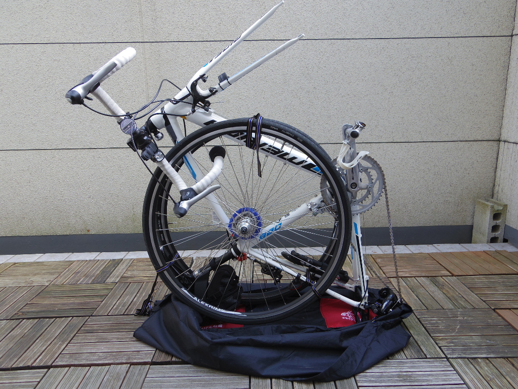 非利用時にボトルケージに収まるほどコンパクトになることが購入のポイントでした。その分、ホイールとフレームとの仕切りがなかったり、比較的生地が薄いというデメリットがあるのですが、ガンガン輪行をする予定はなく、年に数回利用する程度。したがって耐久性は余り求めません。その代わり軽くてコンパクトであることを求めました。遠出をした場合、自転車の不具合やアクシデント、帰りの時間の節約などで電車で帰ってくる必要がある場合に備える保険としてのツールです。