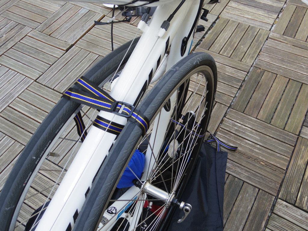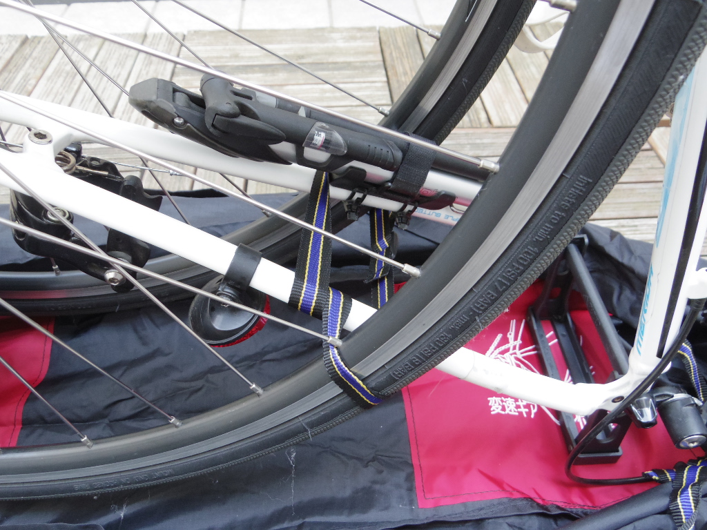 フレームの前三角に対して1本ずつ。3本のベルトでしっかりと前後輪を固定します。タイヤの側面がフレームに当たるようにして、金属部分がフレームに接触しないように慎重に位置決めを行い、「しっかりと」固定します。この固定が甘いと、輪行中に車輪が内部で暴れて、フレームが傷だらけになってしまいますので、くれぐれもしっかりと固定します。