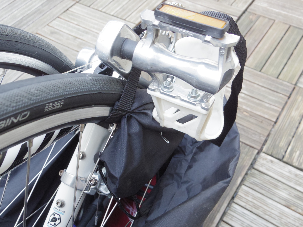 さらに、この袋にはバックル付きの固定ベルトが付いていますので、このようにクランクが回転しないように、この収納袋のベルトでクランクを固定しています。