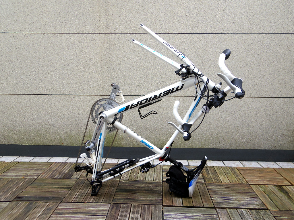 エンド金具を取り付けると、このようにバイクが縦に立つようになります。この状態で袋に収納することになります。