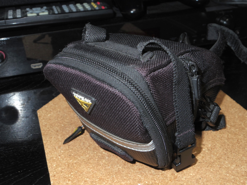 一方シュワルベの方は、気に入っていて利用し続けているのですが、これはコンパクトなので、「持ち出し用」としています。このようにトピークのサドルバッグの中に...。