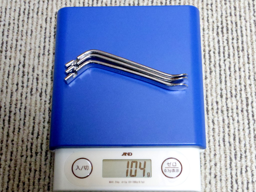 鉄製のタイヤレバーは当然重く、3本で104gもありました。
