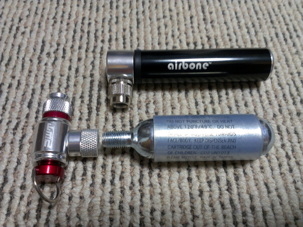 パンク修理時に絶対必要なインフレーター(空気入れ)に関しても CO2 ボンベにカートリッジは1本だけ。併せてマイクロポンプを持つという、同じような思想で装備しています。