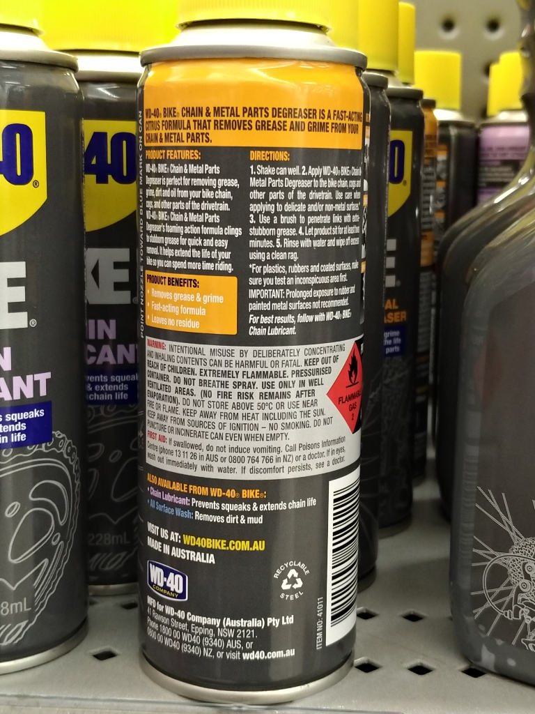 前回シドニーに滞在中、自転車のメンテ用にパーツクリーナーを求めようして失敗。「らしきもの」は単なる灯油でした。その後、シドニーに再度行くことになり、パーツクリーナーとして使用に耐えるものを発見しました。 |