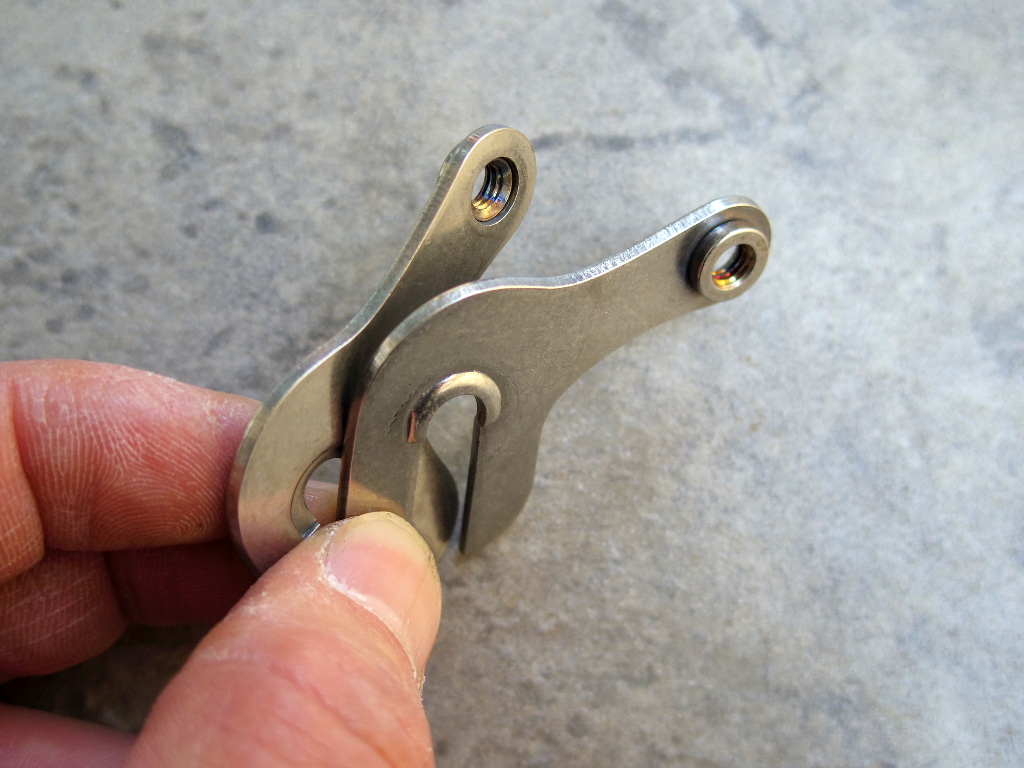 このような配置ができると、キャリアからの下向き荷重がかかっても、このクイックエンドアダプターが回転してしまう症状を抑え込むことができます。このダボ穴にはリアキャリアからの上下の荷重が大きく作用します。そのため、このダボ穴の位置が後輪クイックの車軸と上下方向にずれていると、走行中にだんだんとクイックエンドアダプターが回転してずれてきてしまいます。