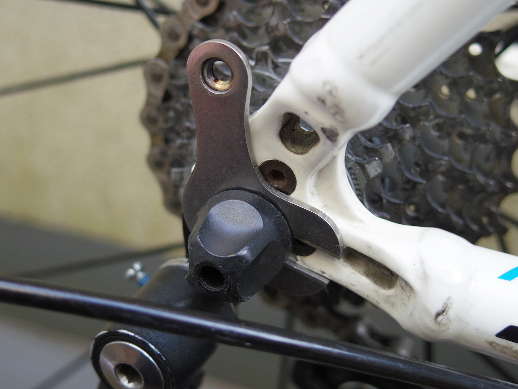 その現象を防止するためには、なるべくこのダボ穴を後輪車軸の直上に配置することが大事ですが、幸いにも私の自転車のフレームではそれが可能でした。つまり、このクイックエンドアダプターをこのように固定することが可能でした。