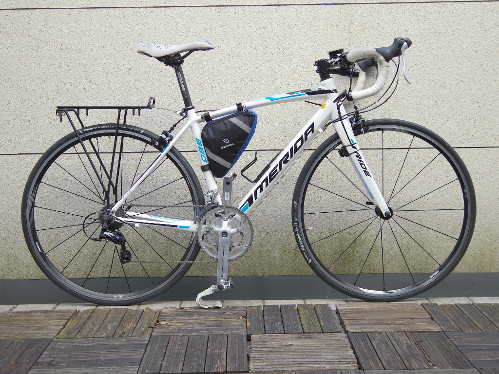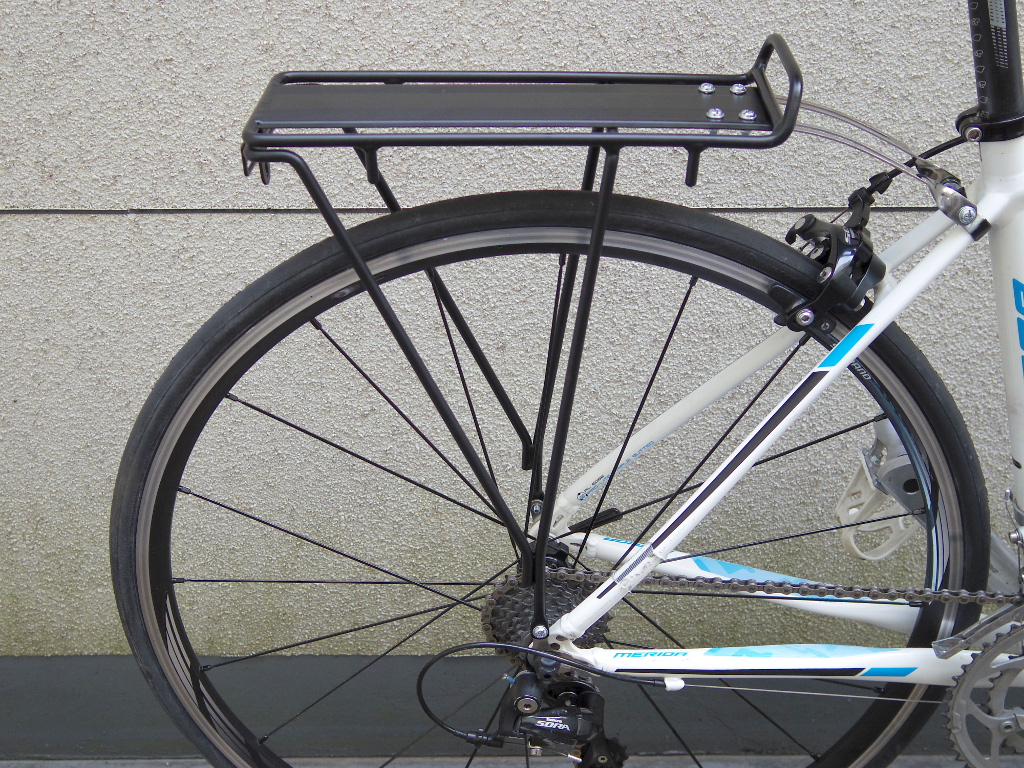 ロードバイクでツーリング用パニアバッグを利用するため、リアキャリアを取り付けることにしました。ロードバイクはリアキャリアを取り付ける前提で設計されていませんが、追加部品を利用することで問題なく装着ができました。 |