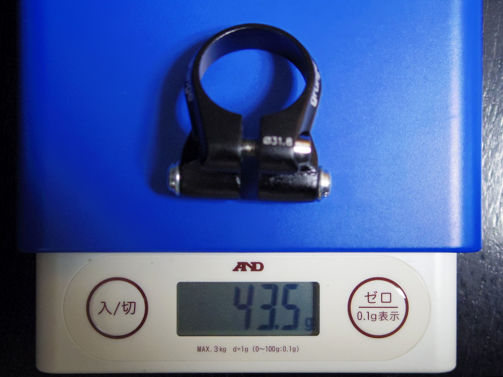 それに対して、「グランジ キャリアダボ付シートクランプ」の重量は43.5g。21.9gの重量増ですが、がっちりと固定できる位置にダボ穴が増設できる効果と安心感は多少の重量増を補って余りあります。躊躇なく、この製品を使います。