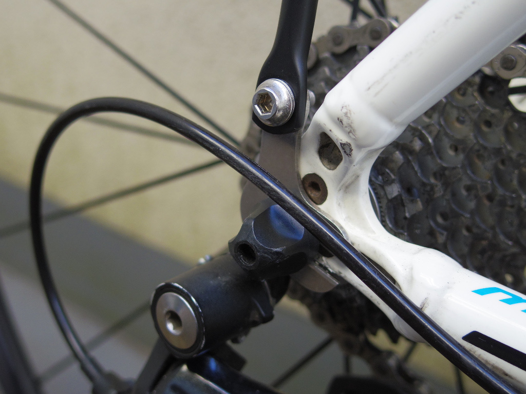 装着するためには、キャリヤ装着用の「ダボ穴」(ねじ穴)が必要です。この種のキャリアでは、ダボ穴は荷重を受け止めるため車軸に向けて一つ、水平方向の固定をするためにシートステー向けに一つ。計2ヶ所のダボ穴が必要です。