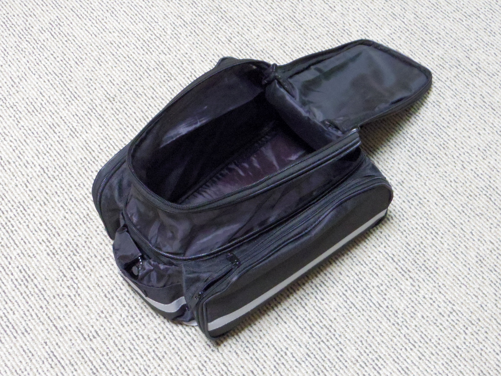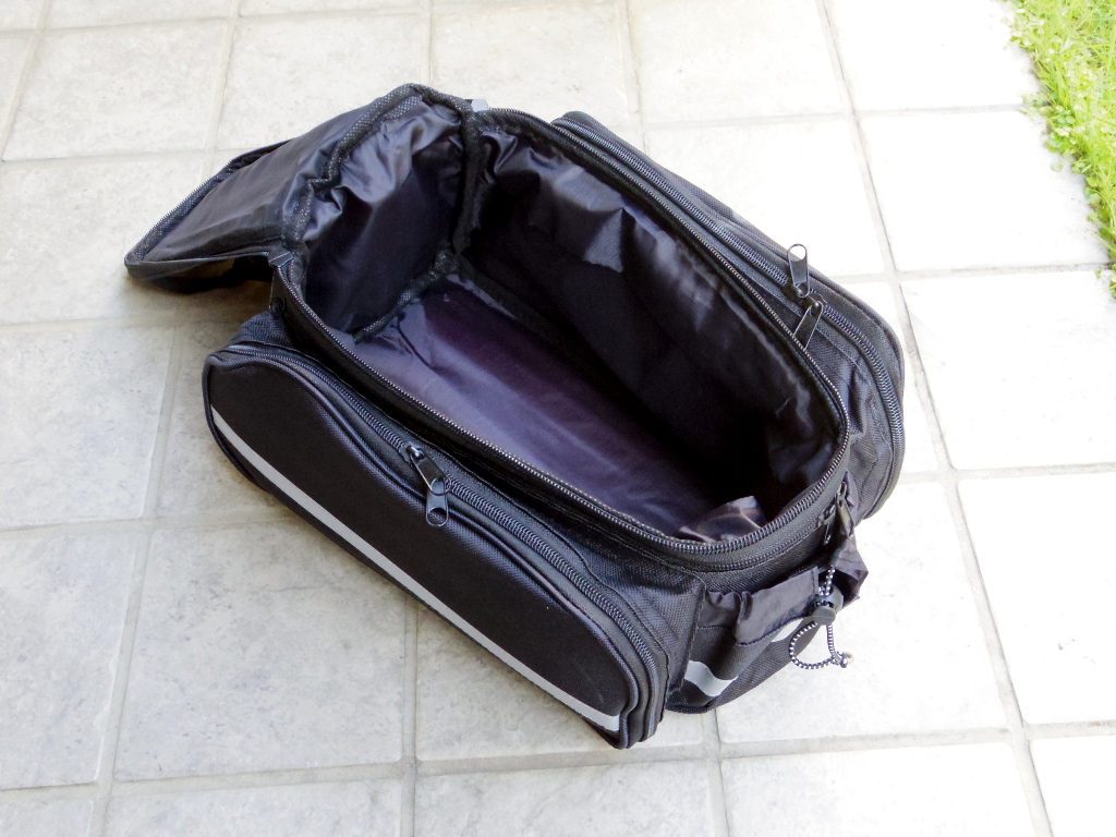 このリア・トランク・バッグ、素材は通常のナイロン・ファブリックで、特に構造上の補強が入っているわけではありません。したがって、側面や底面は柔らかく、収納量がパンパンでない限りは型崩れしがちです。したがって、リアキャリアに装着した際に、バッグ自体が左右に揺れて不安定になることが気になりました。