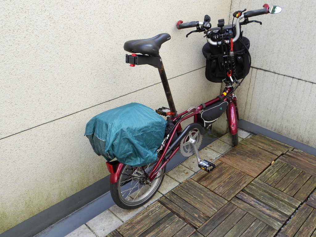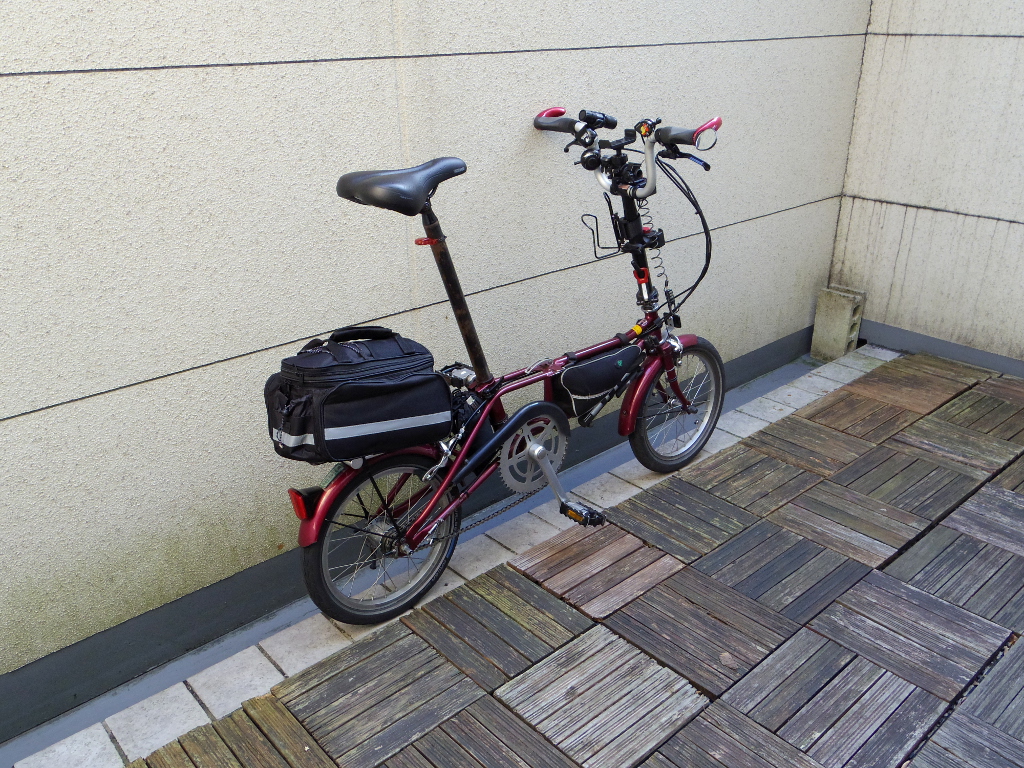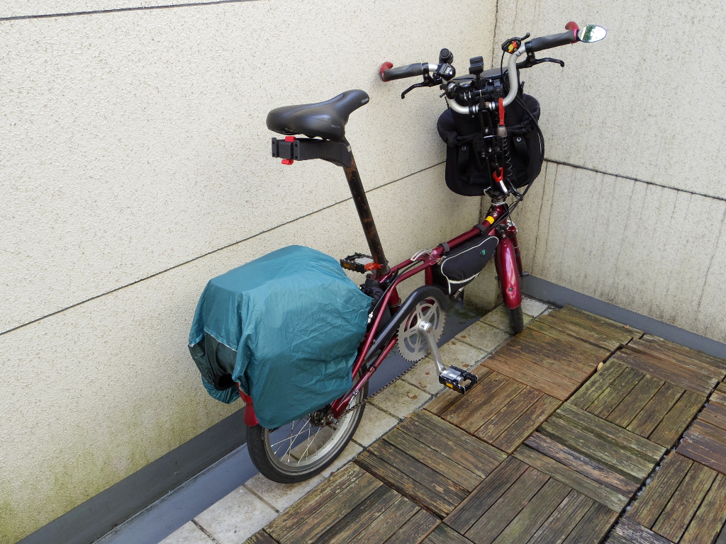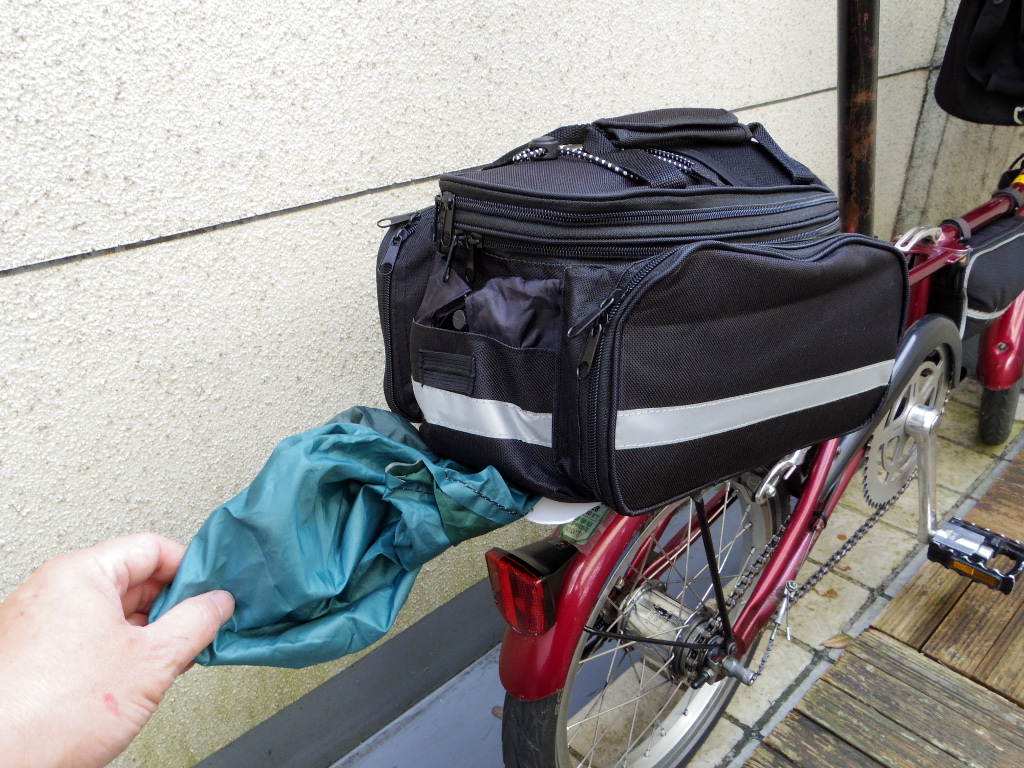 また、このバッグの高さは42cmもあるので、私が持っている小径折りたたみ自転車には取り付けることができません(地面に接触してしまう)。したがって、衝動買いを避けていました。