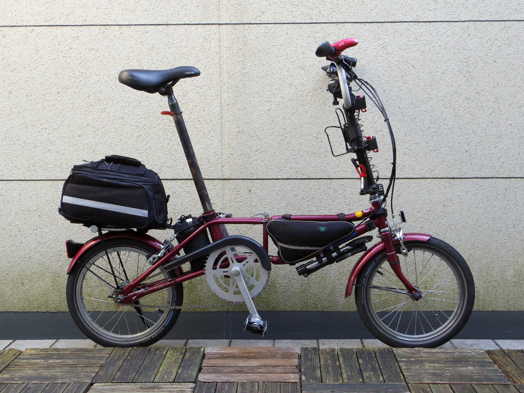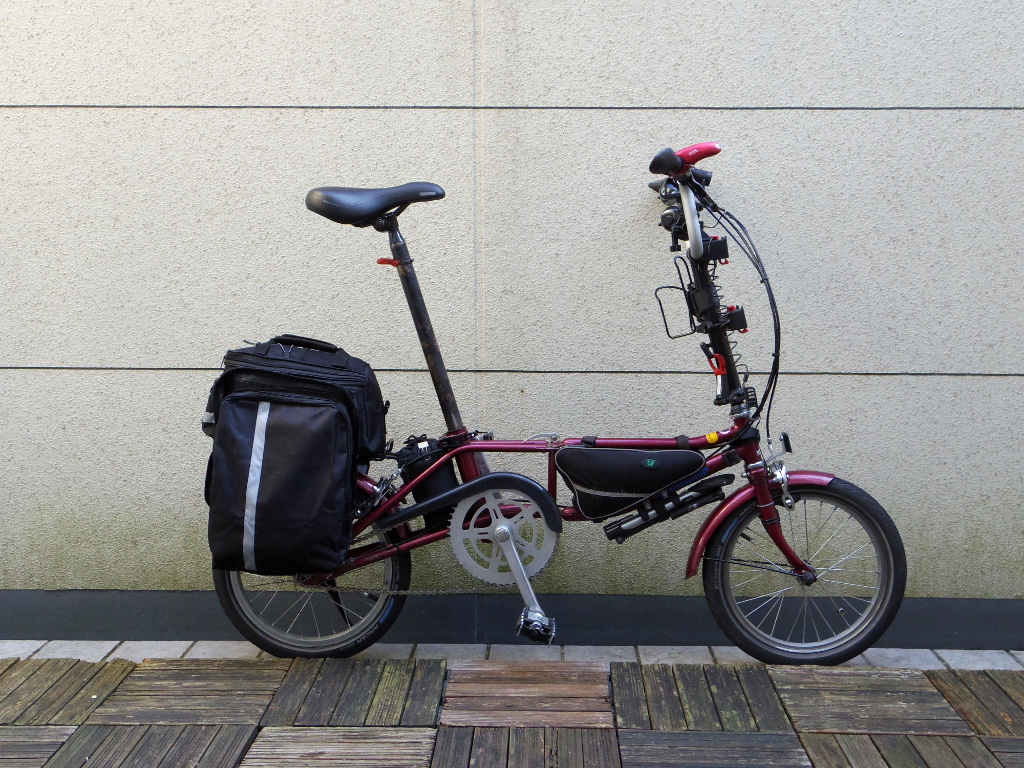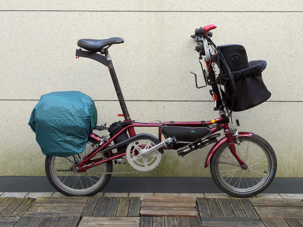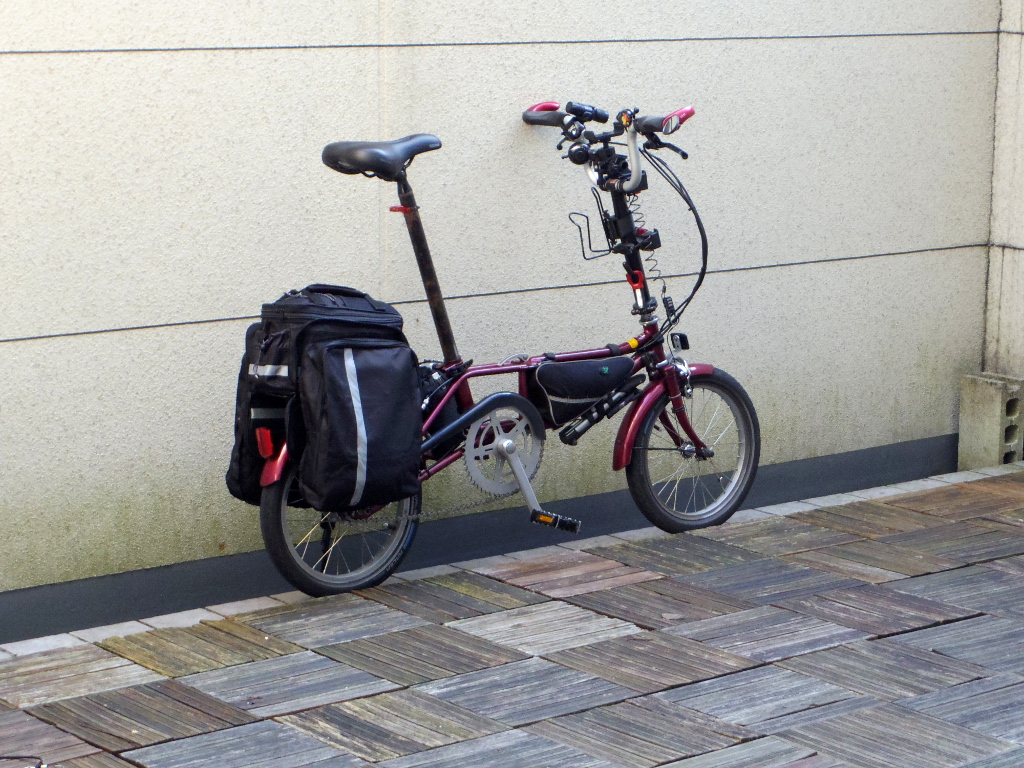 また、このバッグの高さは42cmもあるので、私が持っている小径折りたたみ自転車には取り付けることができません(地面に接触してしまう)。したがって、衝動買いを避けていました。