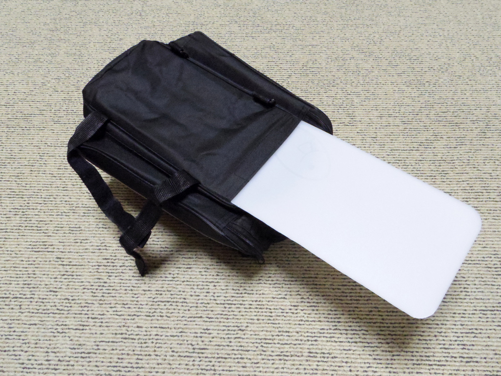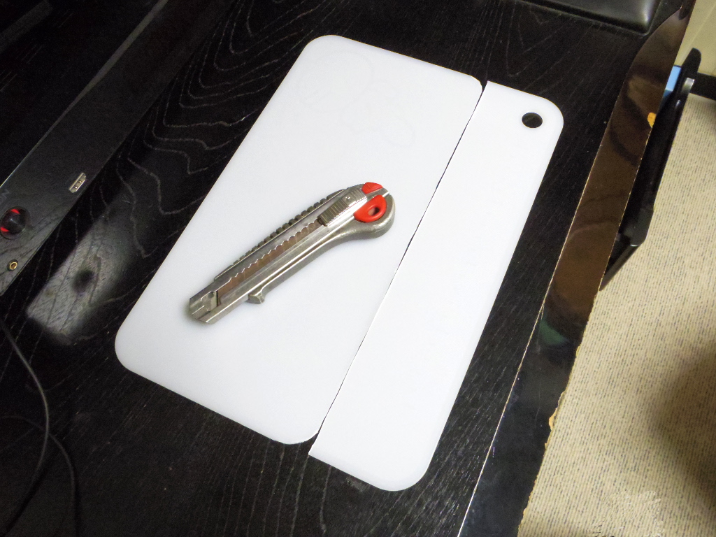 そこで、装着時のしっかり感をだすため、「底板」を入れることにしました。最初は「プラ板」でも調達しようかと思っていましたが、100円ショップを見てみると、それよりもしっかりしている良さげなものを見つけました。「まな板」です。プラスチック製で厚さは1mm程度。これよりも厚いものもありましたが、それだとオーバースペックです。重量も重くなりますので、これにしました。
