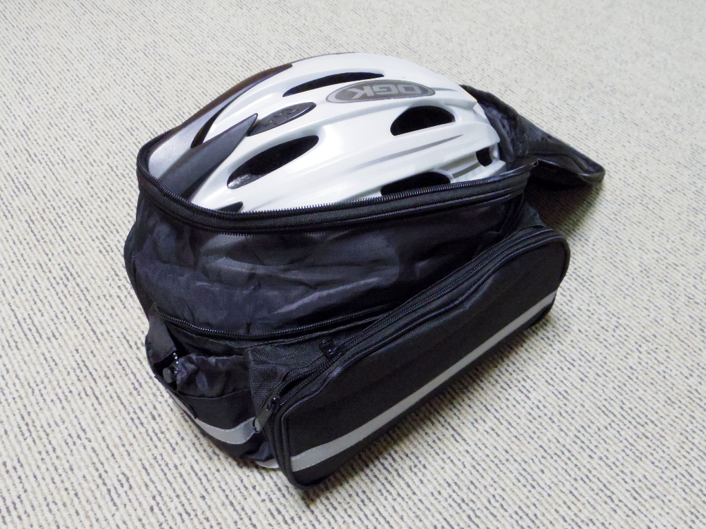 そうすると案外収納力が大きくなり、自転車用のヘルメットをこのように「横にして」入れると...。