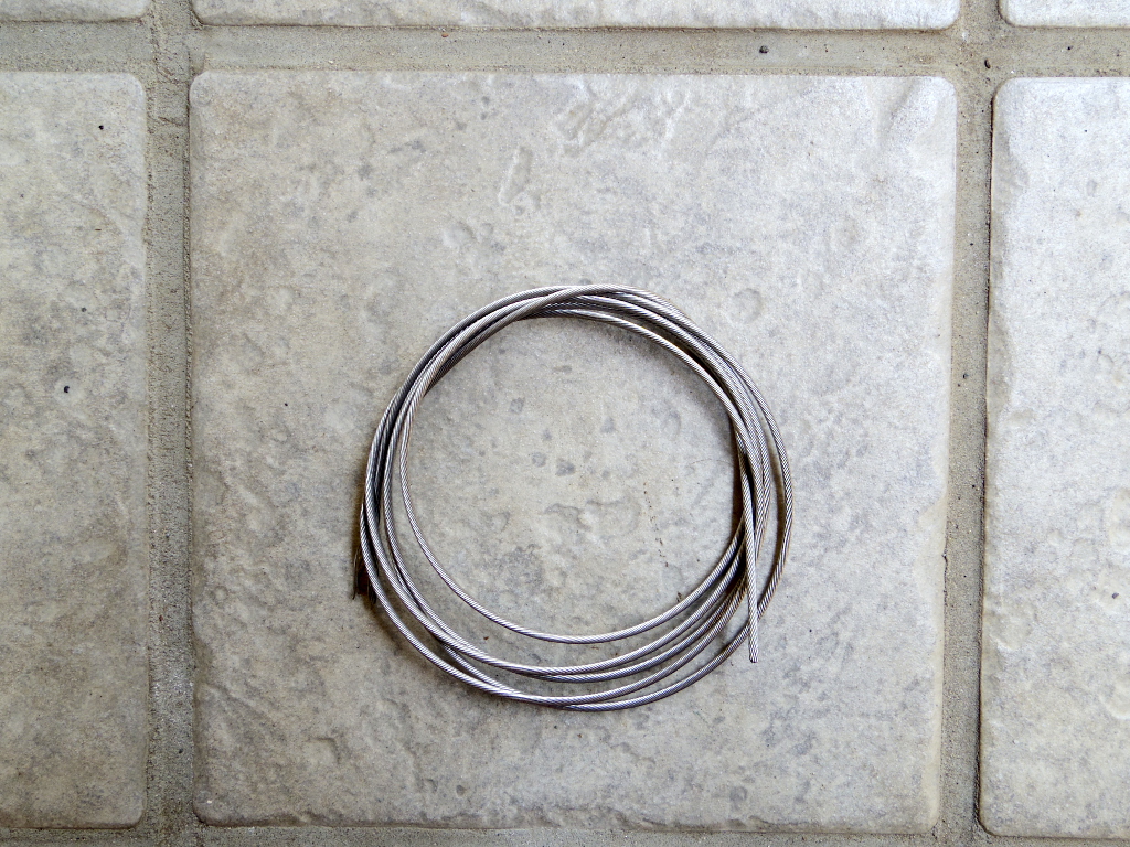 以前、フロントブレーキケーブルを取り替えた際に余っていたブレーキケーブルです。その他、ローター外しのための素材一式はこちら。棚を作ろうとして買ったにも関わらず、サイズ違いで日の目を見なかった、アイリスオーヤマのメタルラックシリーズのサイドバー。100円ショップで買った結束バンド(小)、それとブレーキケーブルです。