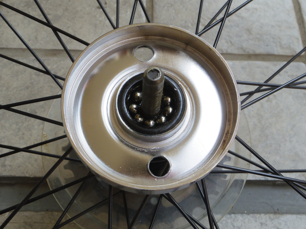 で、やってみます。まずは車軸のベアリングの玉押しを取り去ります。こうしないとサイドバーをローターに近づけられません。ベアリング部を開けたついでにグリスアップを行っておくと良いですね。