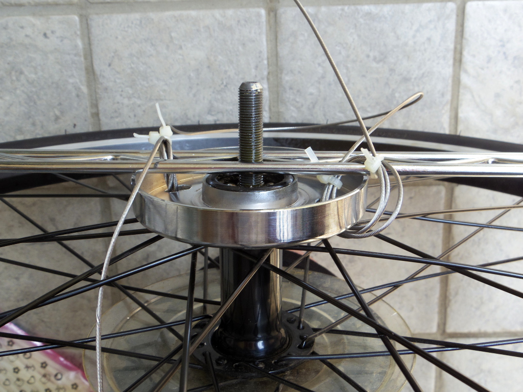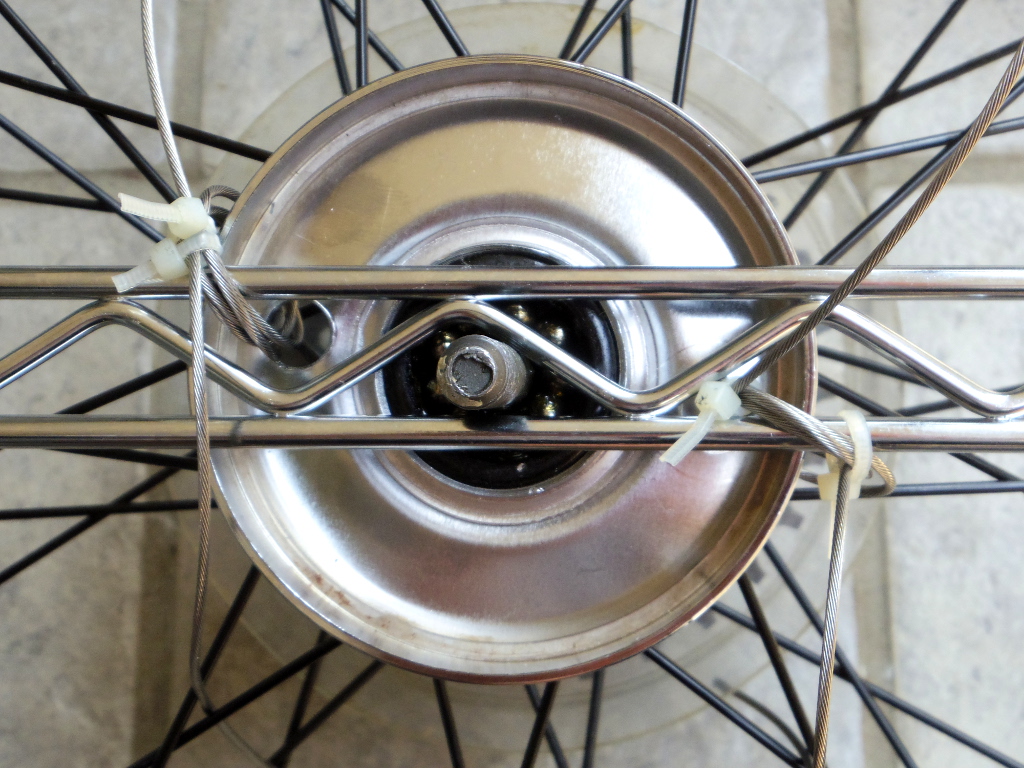 そう、このサイドバーとブレーキローターの穴をブレーキワイヤーでくくりつけれる魂胆です。ブレーキワイヤーのしなやかさと強靭さは折り紙つき。このブレーキワイヤーを何回か穴に通せば、この「ラスボス」も陥落するに違いありません。