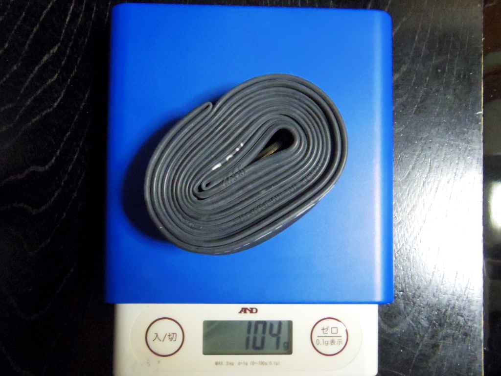 チューブの重さは104g。巻きを止めているゴムが1~2gあるので、バルブキャップ込みの正味重量は102~103g だと思います。