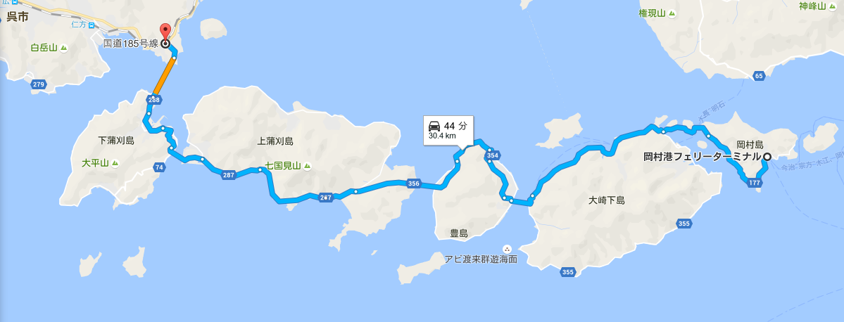 岡村島は今治市管轄。岡村大橋を渡って中ノ島からは広島県呉市の管轄となります。