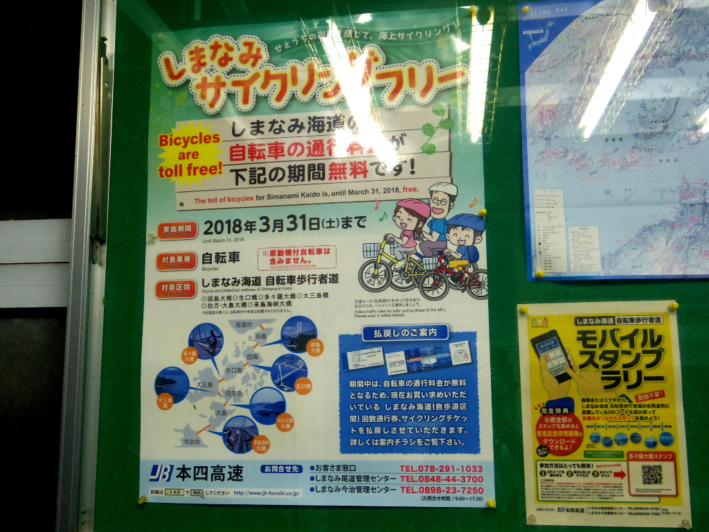 初回にしまなみ海道を走った時は橋の通行料金は有料だったのですが、今回は自転車ツーリング奨励の施策によりすべての橋で通行料金が無料でした。
