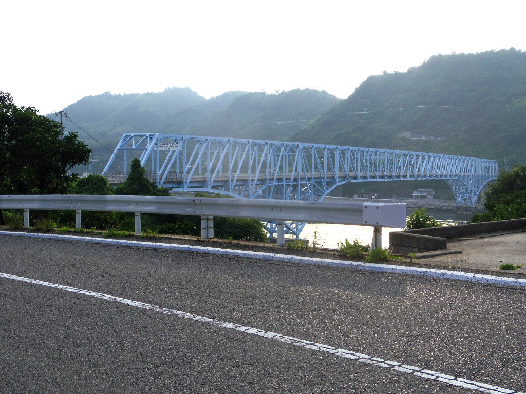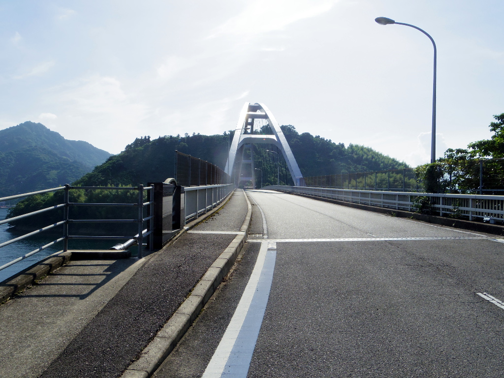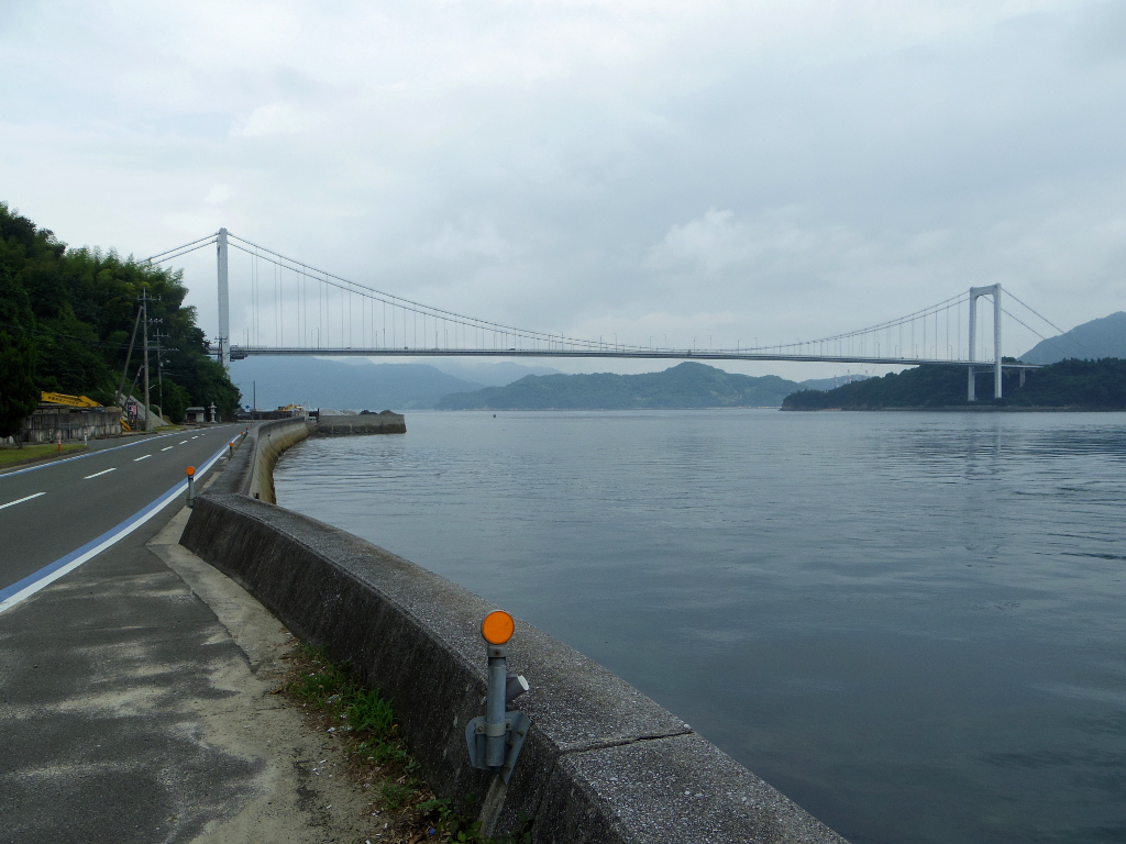 はっきり言って、とびしま海道の最難所はここです。海面までの距離は40m余ということで、来島海峡大橋よりも低いのですが、恐らくアプローチ距離が短く斜度が高いため、橋にたどり着くのに最もパワーを使いました。