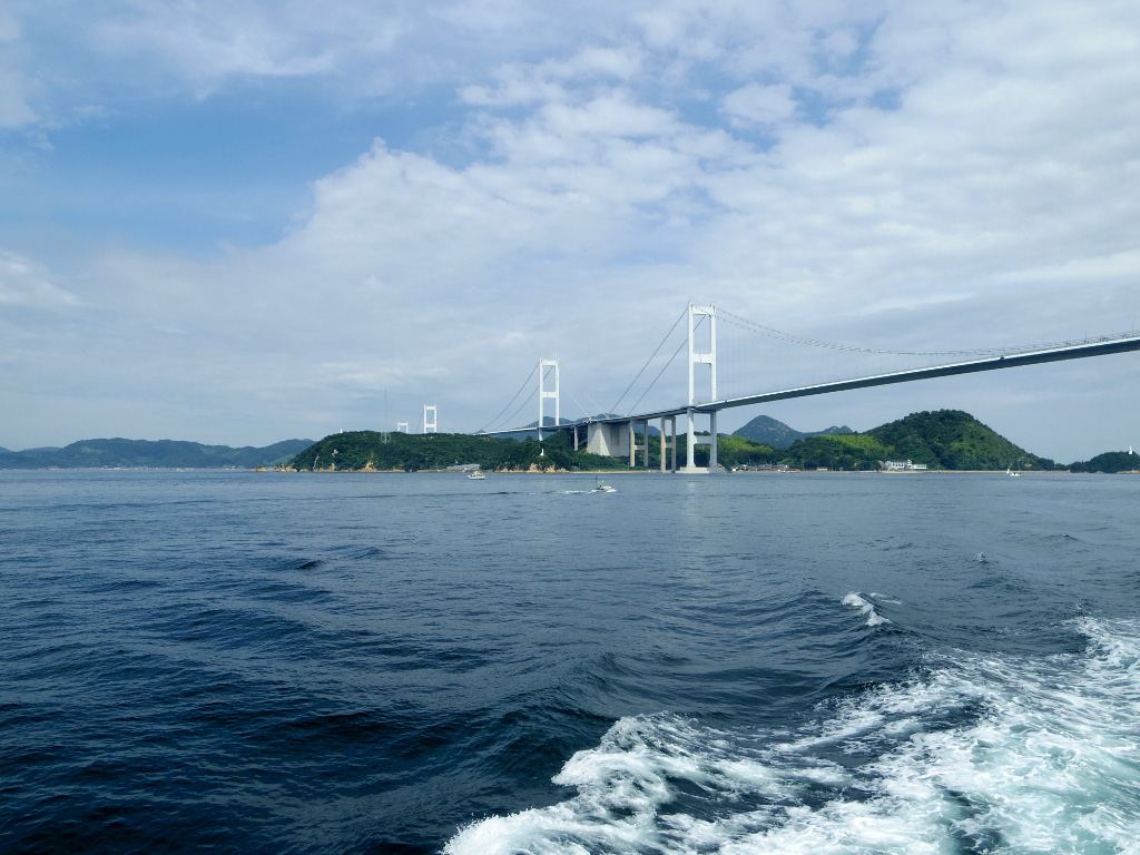 3連橋全体はフェリーが出港してだいぶ経たないと見れないほどの大きさでした。こんな巨大で美しいものを作ってしまうなんてすごい、と改めて技術立国日本のすごさを感じていました。