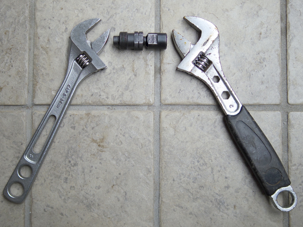 あとは、シャフト押し側のねじを止まるまで手で回してゆき、止まったら、2本のモンキーレンチを使ってさらに押し込み方向に回します。