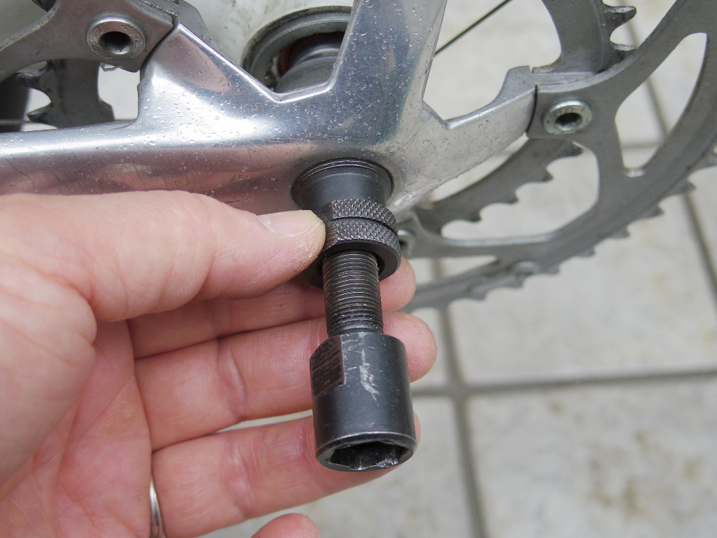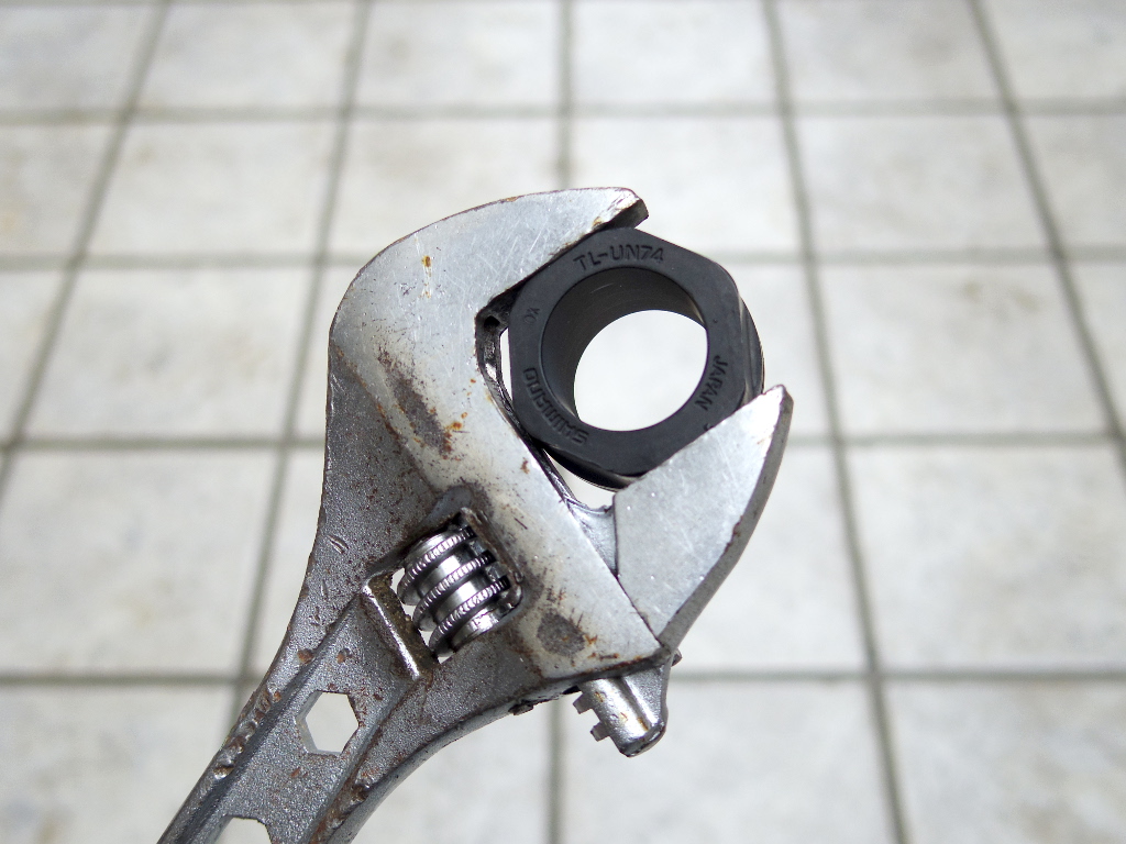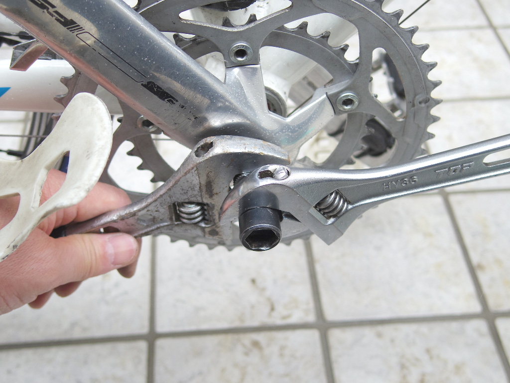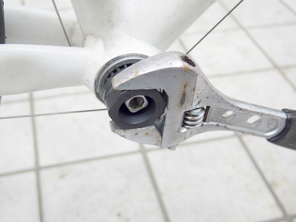 次にクランクを外します。このロードバイクのクランクはエントリータイプで良く使われる「スクエア・テーパー」タイプのもの。そのクランクの取り外しには特殊工具が必要です。「シマノ TL-FC10」に代表される「コッタレス抜き」と呼ばれる工具が必要です。あと大きめのモンキーレンチが2つ必要。
