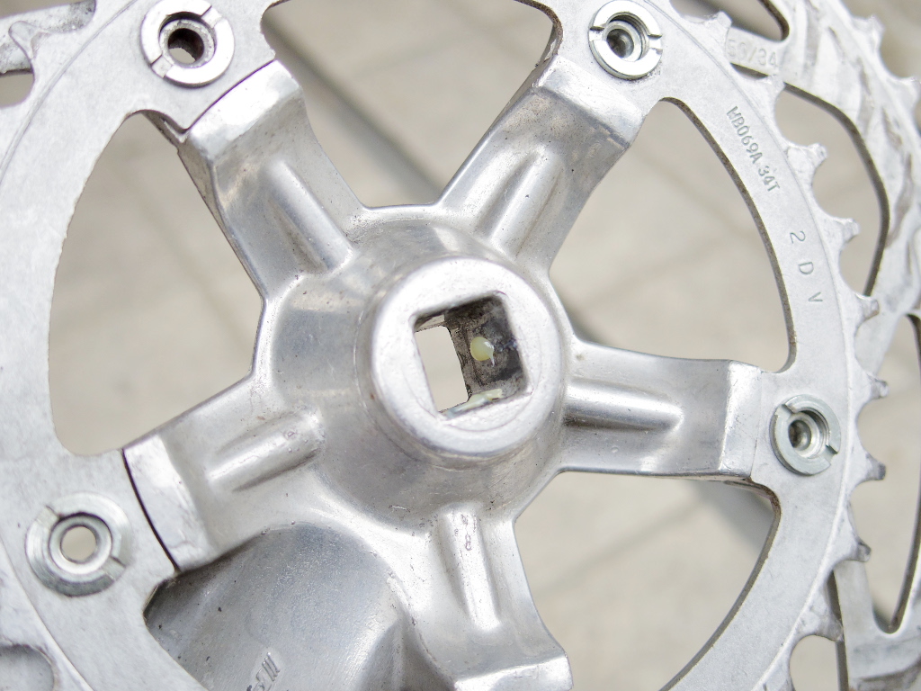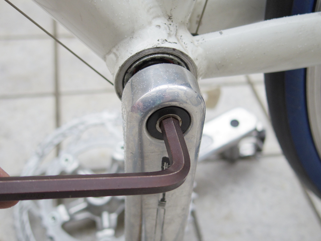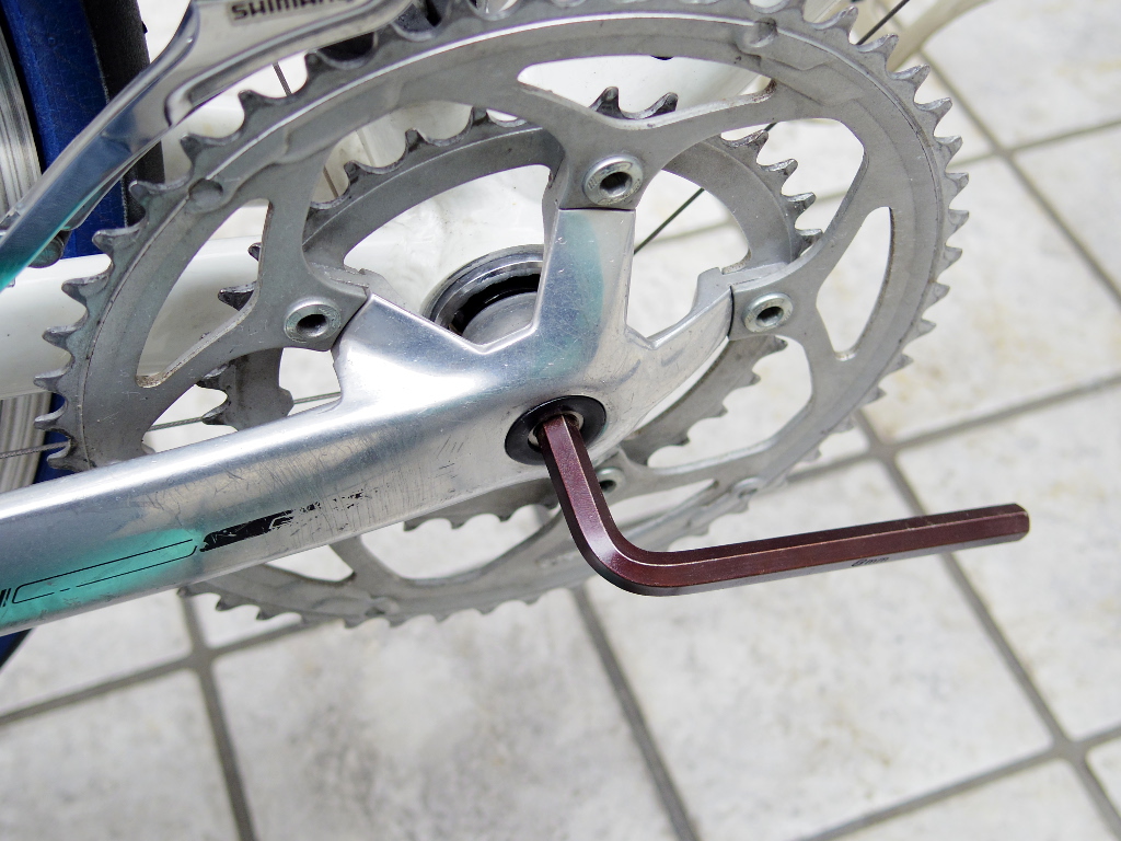 まず、スクエア・テーパー・シャフトとクランクを固定しているフィキシング・ボルトを取り外します。適合する六角レンチは8mm、割と大きめのサイズです。