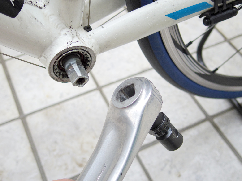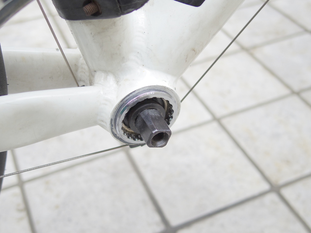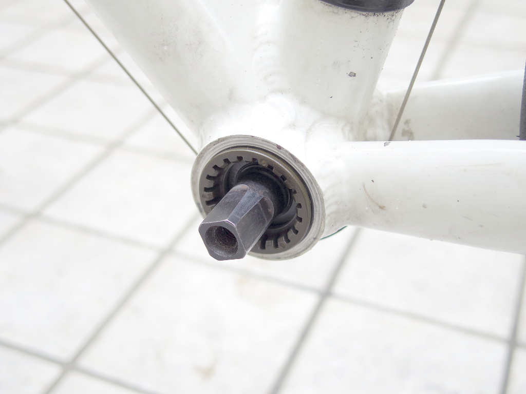 次にBBを取り外します。このロードバイクにはエントリータイプのバイクに良く使われるスクエア・テーパー型BBが装着されています。このタイプのBBを取り外すには、この工具が必要です。