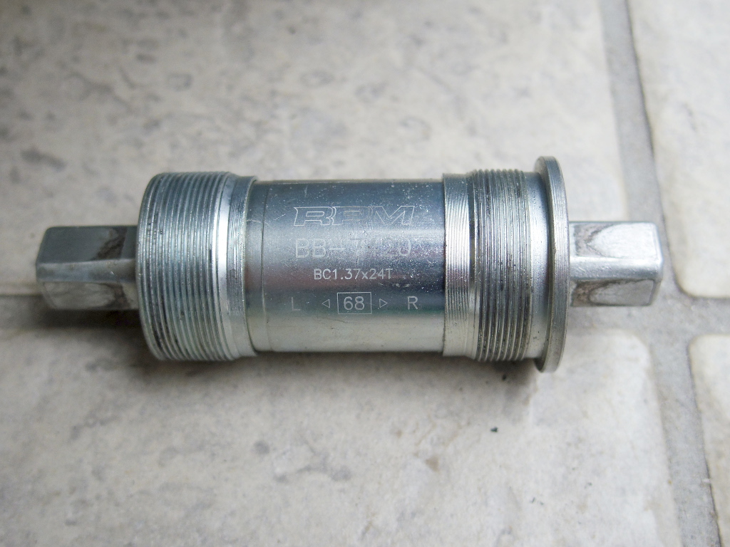 BBを取り外しました。RPM(FSA)の BB-7420 です。取り外し後、BBシャフトを指で回してみましたが、やはり「スカスカ」でした。ベアリングが摩耗したか、玉当たりが緩んだかわかりませんが、明らかにシャフトがぶれてしまっています。交換して正解でした。