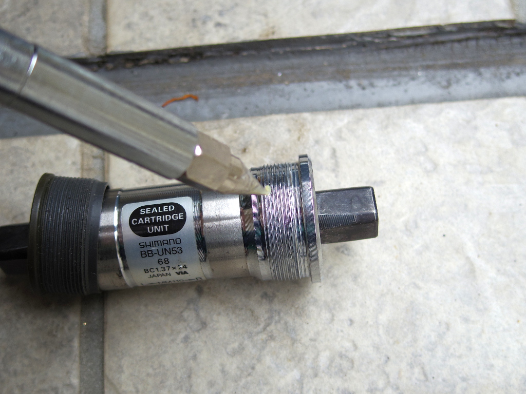 BB を取り外したのち、フレームのBB取付部を清掃し、新しいBBを取り付けます。取り付けるBBは、SHIMANO のカートリッジBBとしては廉価クラスの BB-UN53 です。取付前にねじ部にグリスを塗っておきます。