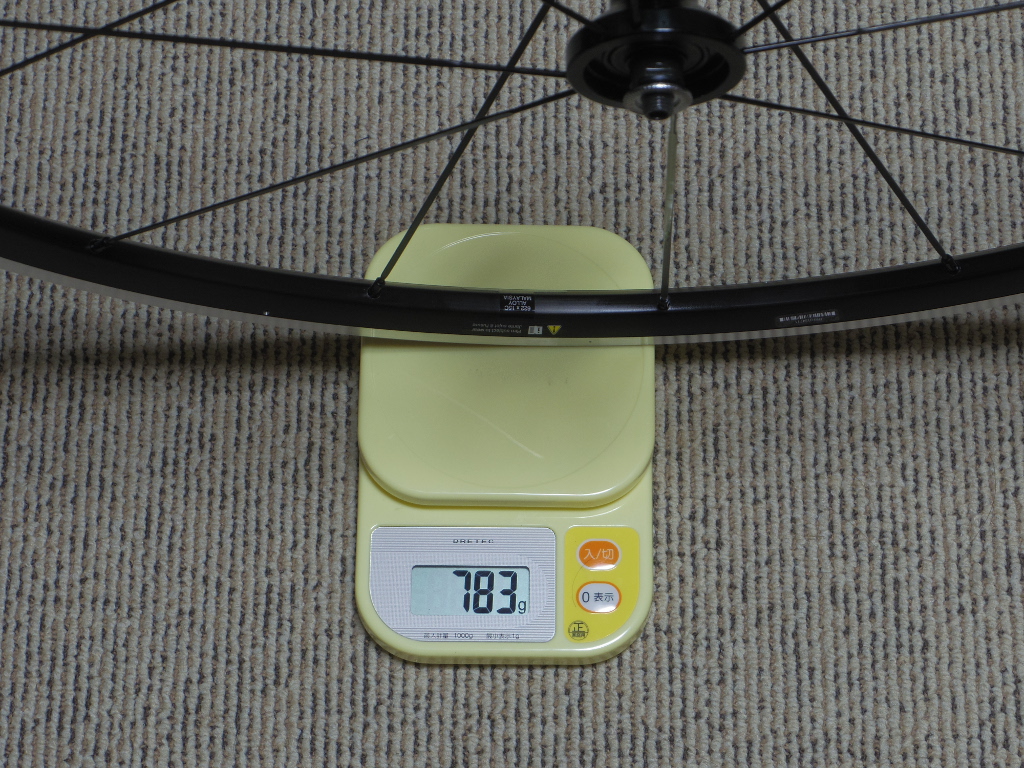 前輪の重さは 783g でした(クイックなし、リムテープ込)。